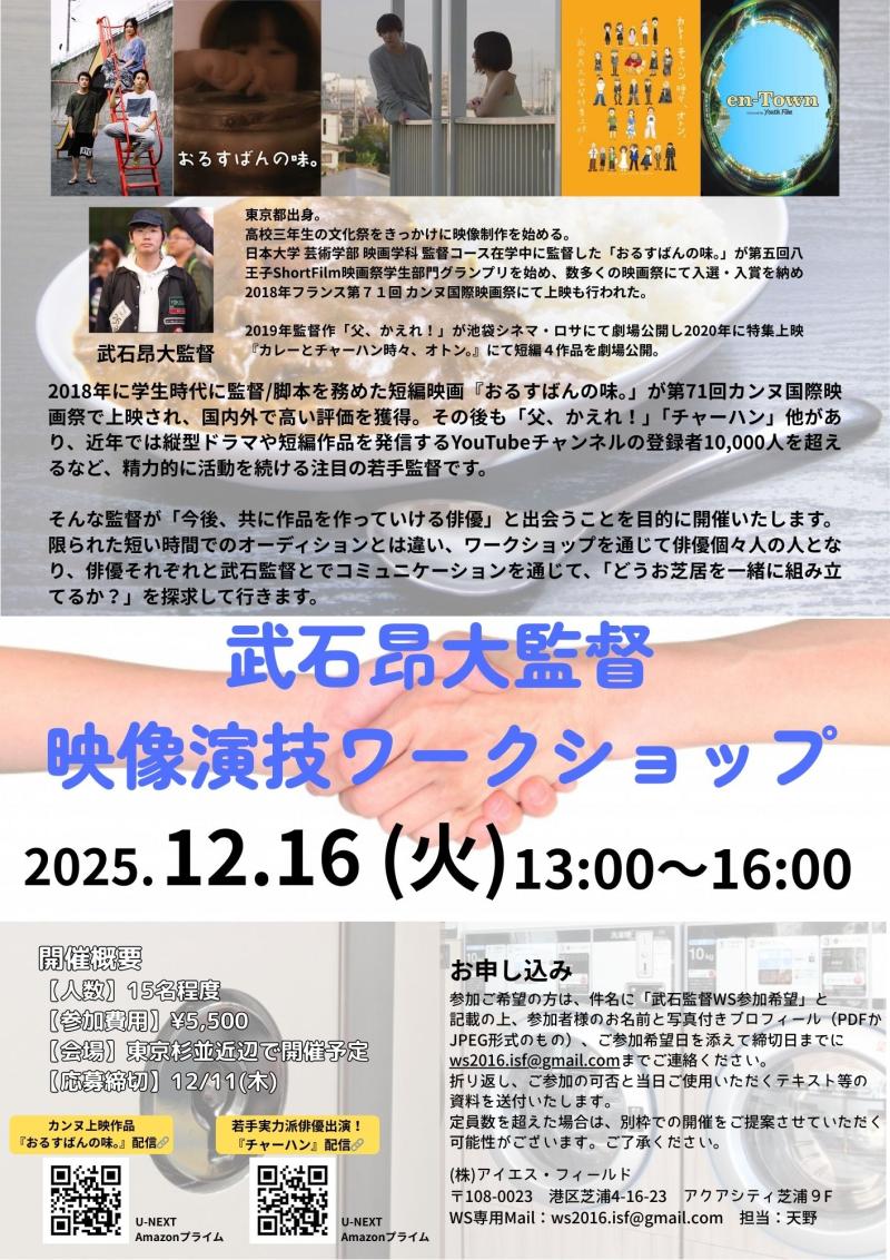 締切:2025/12/11 この度、武石監督による映像演技ワークショップの開催が決定いたしました。詳しくは下記をご参照ください。2018年に学生時代に監督/脚本を務めた短編映画『おるすばんの味。」が第 ...