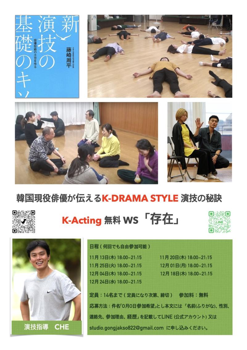 韓国現役俳優が伝える韓ドラSTYLE演技WS(無料 / 12月) こんにちは、スタジオ共作所の代表CHEです。