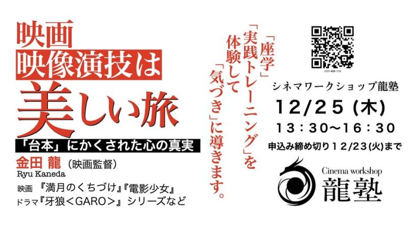 締切:2025/12/23 ・映画『満月のくちづけ』『電影少女』『牙狼<GARO>』シリーズなどの映画監督 金田 龍が「映像演技」ワークショップを実施します!